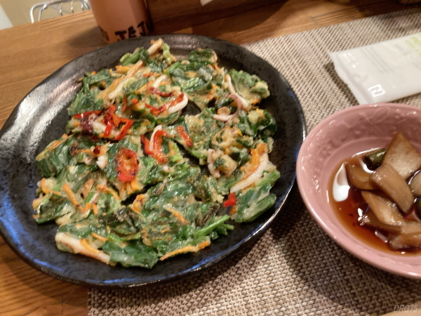 ママの手作りおつまみが魅力。チヂミ本体も香ばしくて美味で、韓国っぽいタレも絶妙。