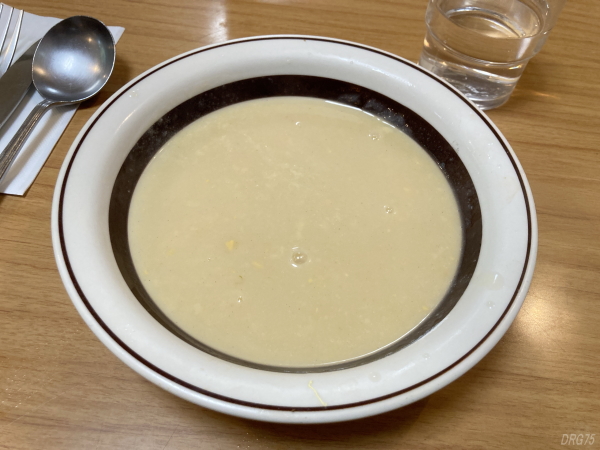 ランチの豚生姜焼に付いてくるコーンスープ、ちょっとしょっぱめだけどまろやかなコーンの味わい。